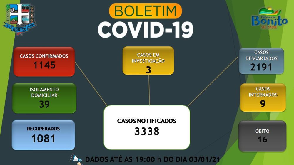Segundo dados divulgados pela Secretaria Municipal de Saúde de Bonito (MS) nesta segunda-feira (04), há 1.145 casos confirmados de Covid-19 no município, sendo que 1.081 já estão recuperados.