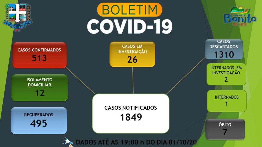 Segundo dados divulgados pela Secretaria Municipal de Saúde de Bonito (MS) nesta sexta-feira (02), há 513 casos confirmados de Covid-19 no município, sendo que 495 já estão recuperados.