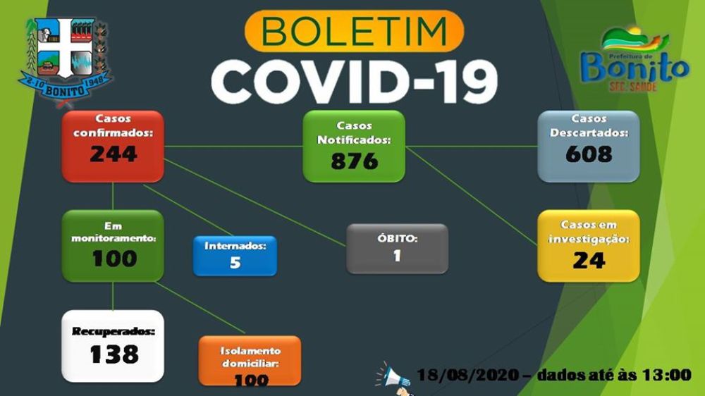 Segundo dados divulgados pela Secretaria Municipal de Saúde de Bonito (MS) nesta terça-feira (18), há 244 casos confirmados de Covid-19 no município, sendo que 138 já estão recuperados.