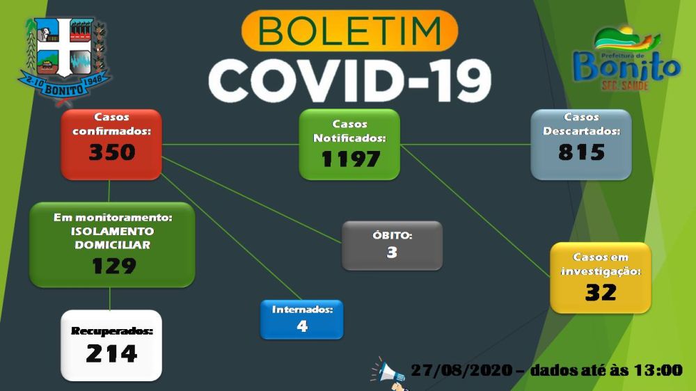 Segundo dados divulgados pela Secretaria Municipal de Saúde de Bonito (MS) nesta quinta-feira (27), há 350 casos confirmados de Covid-19 no município, sendo que 214 já estão recuperados.
