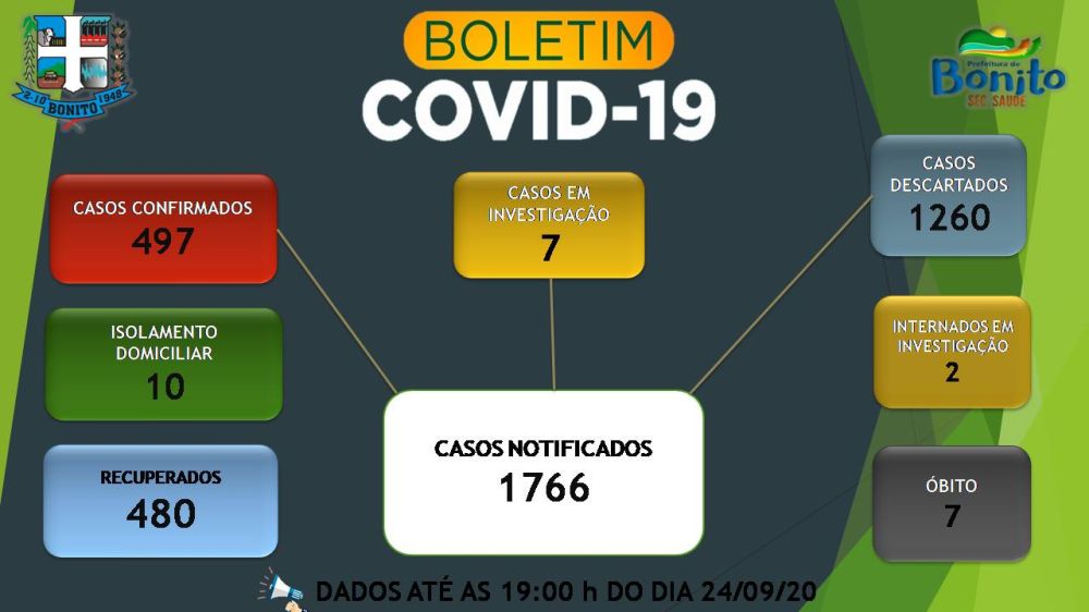 Segundo dados divulgados pela Secretaria Municipal de Saúde de Bonito (MS) nesta sexta-feira (25), há 497 casos confirmados de Covid-19 no município, sendo que 480 já estão recuperados.