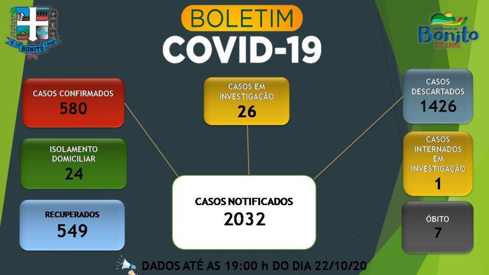 Segundo dados divulgados pela Secretaria Municipal de Saúde de Bonito (MS) nesta sexta-feira (23), há 580 casos confirmados de Covid-19 no município, sendo que 549 já estão recuperados.