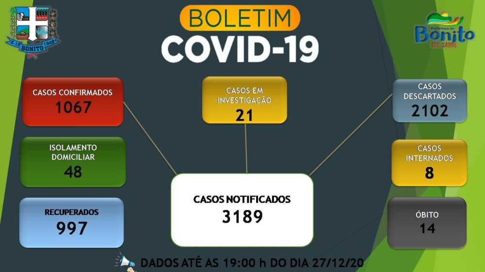 Segundo dados divulgados pela Secretaria Municipal de Saúde de Bonito (MS) nesta segunda-feira (28), há 1.067 casos confirmados de Covid-19 no município, sendo que 997 já estão recuperados.