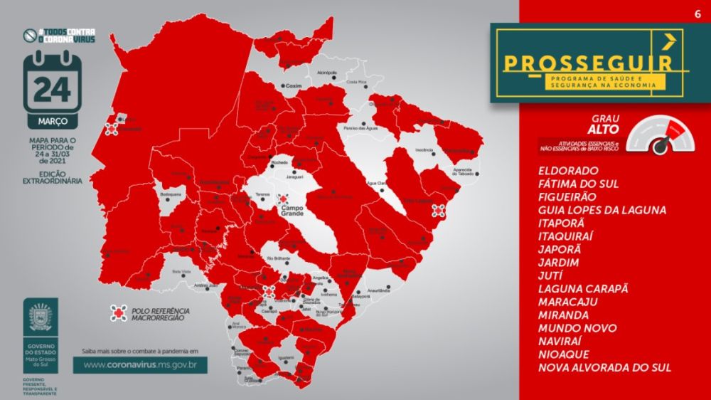 E ainda: Ribas do Rio Pardo, Rio Negro, Rio Verde de Mato Grosso, Santa Rita do Pardo, São Gabriel do Oeste, Selvíria, Sidrolândia, Sonora, Tacuru, Taquarussu e Três Lagoas. Completando o mapa, 24 municípios estão na cor laranja (médio grau de risco) e três na amarela (tolerável). Nenhum deles está na verde (baixo risco). Em relação a última semana, 17 municípios regrediram na classificação, 54 permaneceram com o mesmo grau de risco e apenas 8 progrediram.