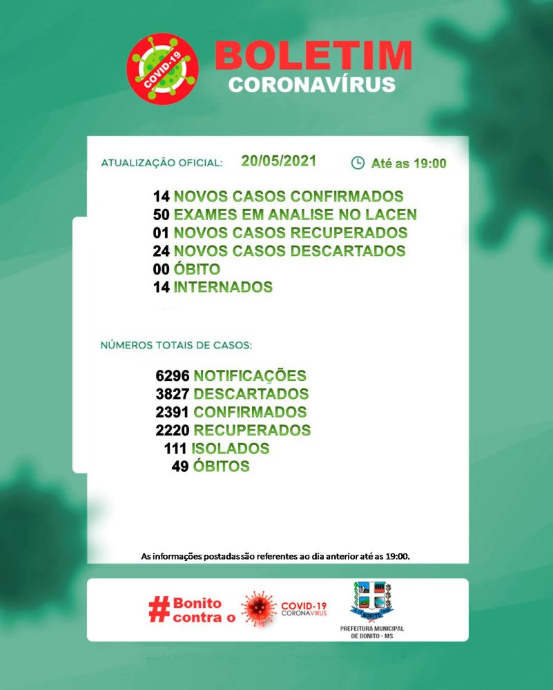 Segundo dados divulgados pela Secretaria Municipal de Saúde de Bonito (MS) nesta sexta-feira (21), há 2.391 casos confirmados de Covid-19 no município, sendo que 2.220 já estão recuperados.
