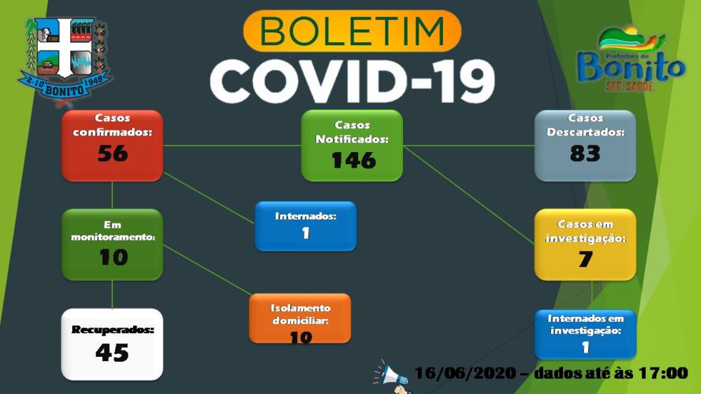 Dados divulgados pela Secretaria Municipal de Saúde de Bonito (MS) na terça-feira (16), revelam que há 56 casos confirmados de Covid-19, sendo que destes 45 já estão recuperados.
