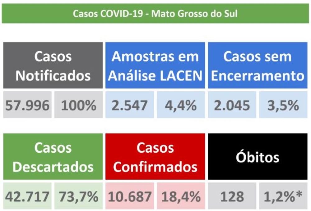Desde o dia 25 de fevereiro, foram registradas 57.996 notificações de casos suspeitos da coronavírus em Mato Grosso do Sul. Destes, 42.717 foram descartados após os exames darem negativo para Covid-19, 21 foram excluídos por não se encaixarem na definição de caso suspeito do Ministério da Saúde, 2.547 exames aguardam resultado do Laboratório Central de Saúde Pública (Lacen) e 2.045 casos foram notificados e não foram encerrados pelos municípios.