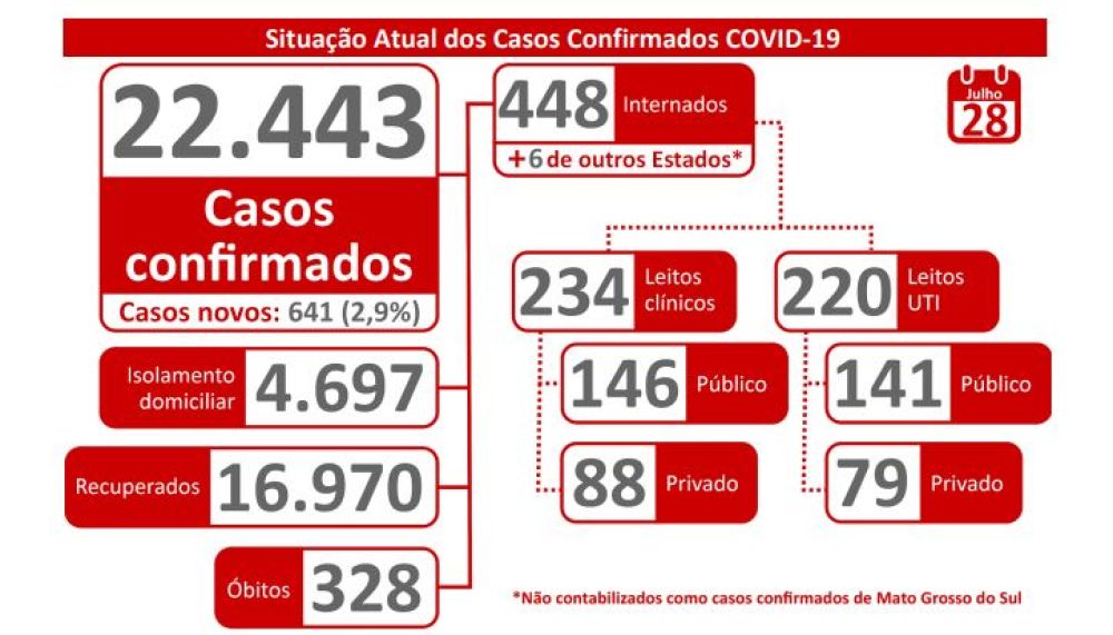 Dos 22.443 casos confirmados,4.697 estão em isolamento domiciliar, 16.970 estão sem sintomas e já estão recuperados e 448 estão internados, sendo 287 em hospitais públicos e 167 em hospitais privados. 6 pacientes internados são procedentes de fora do Estado.