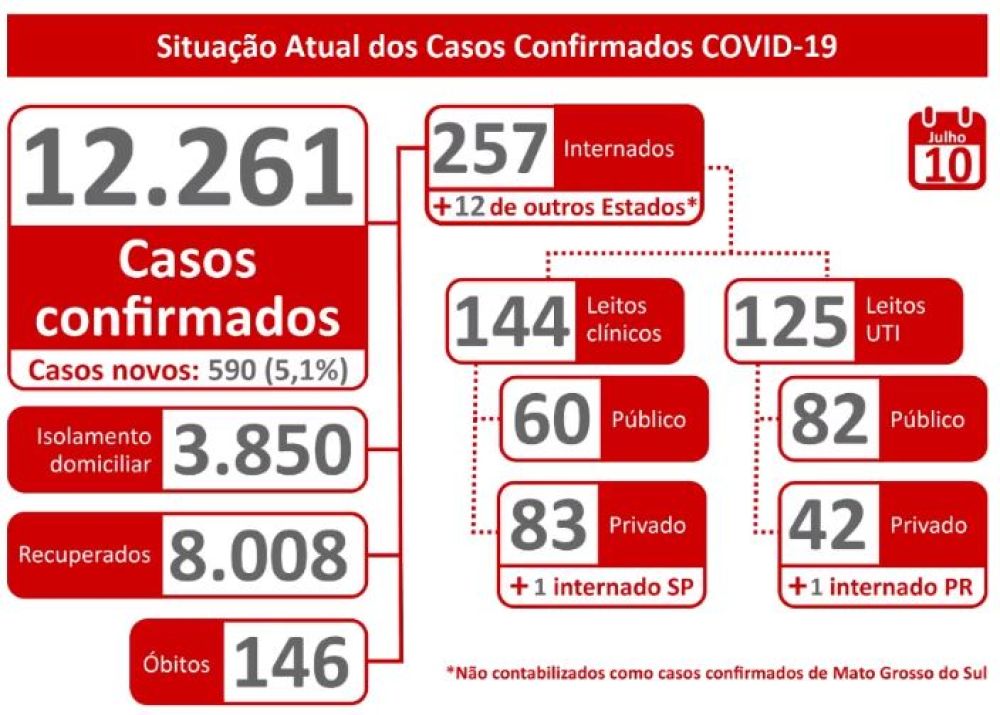 Dos 12.261 casos confirmados, 3.850 estão em isolamento domiciliar, 8.008 estão sem sintomas e já estão recuperados e 269 estão internados, sendo 142 em hospitais públicos e 127 em hospitais privados. 12 pacientes internados são procedentes de fora do Estado.
