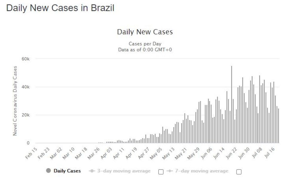 Gráfico revela também a queda de registro de novos casos da doença no país. Em 19 de julho foram registrados 24.650 novos casos. No dia 18 de julho, 26.549 novos casos e no dia anterior (17/07) foram confirmados 33.959. No dia 16 de julho foram confirmados 43.829 casos.