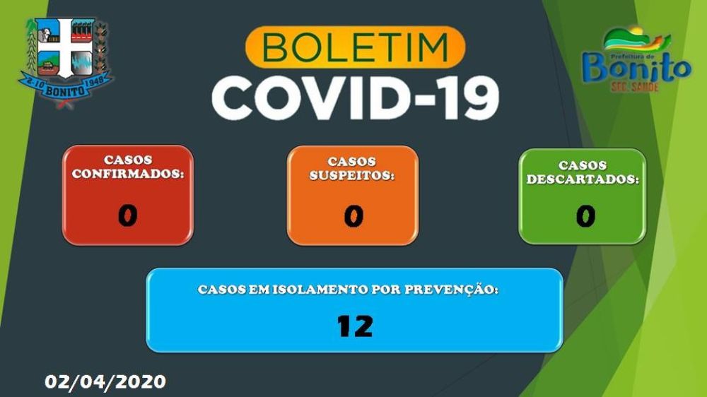 A Secretaria Municipal de Saúde de Bonito divulgou na tarde desta quinta-feira (02), um boletim atualizado sobre as ações de combate ao Coronavírus no município. Até o momento, não existe nenhum caso suspeito ou confirmado da doença em Bonito.