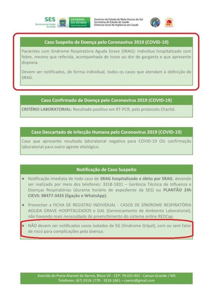 A Secretaria Municipal de Saúde de Bonito considera importante ressaltar que de acordo com a segunda imagem da Secretaria de Estado de Saúde, casos suspeitos são considerados apenas em pacientes hospitalizados em Síndrome Respiratória Aguda Grave (SRAG), sendo os exames de confirmação destinados para esses casos. Também destaca que casos de pacientes com sintomas gripais isolados não devem ser notificados como caso suspeito, com ou sem fator de risco para complicação pela doença.