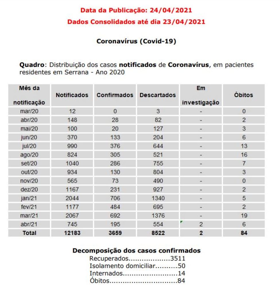 Até o dia 24 de abril, 745 casos de Covid-19 foram notificados sendo que 195 foram confirmados. 6 pessoas morreram em decorrência da doença no município.