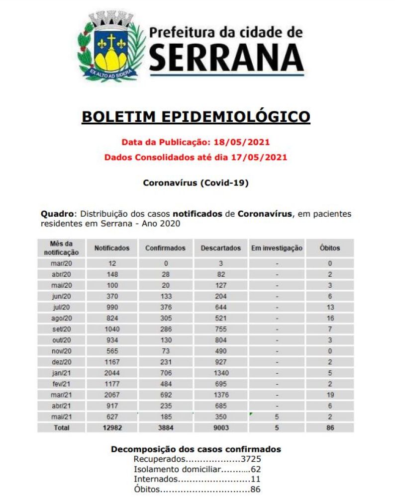 Boletim epidemiológico divulgado pela Prefeitura de Serrana (SP) no dia 18 de maio revela que 11 pessoas seguem internadas com Covid-19 no município.