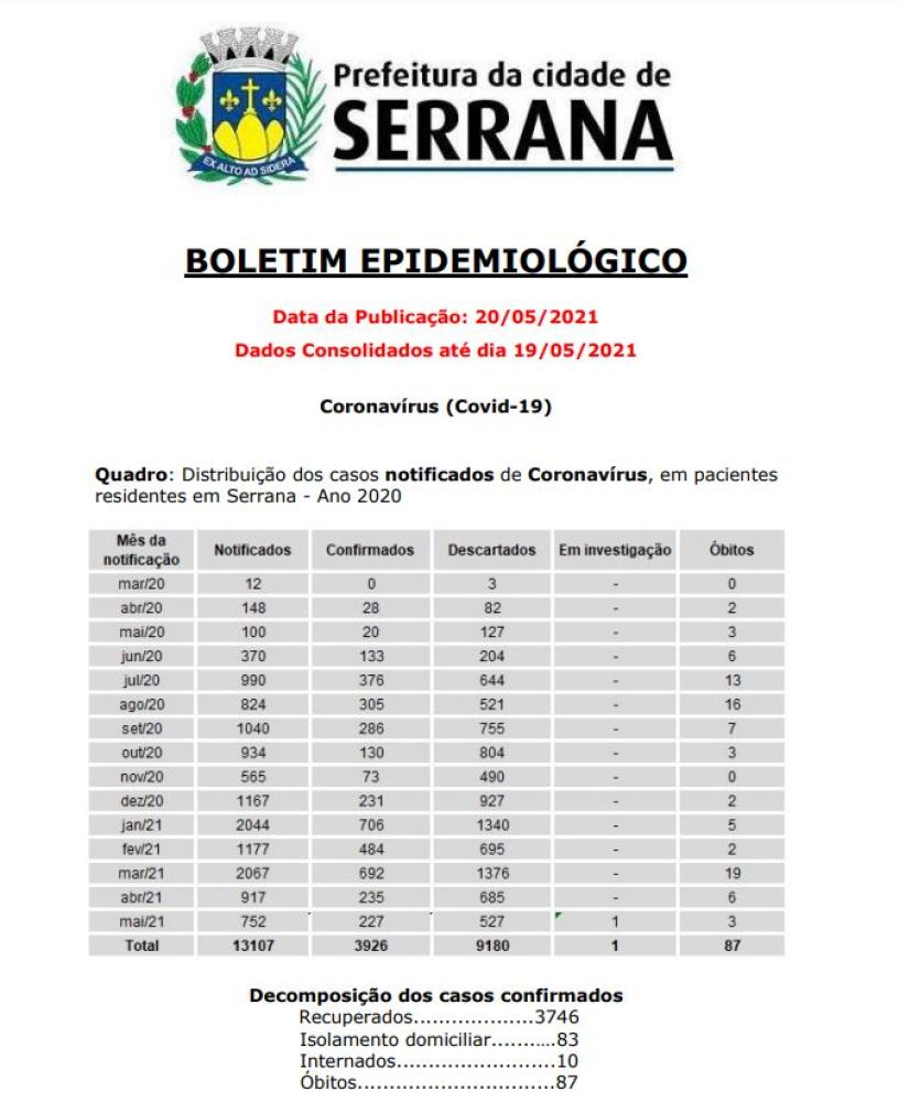 Boletim epidemiológico divulgado pela Prefeitura de Serrana (SP) no dia 20 de maio revela que 10 pessoas seguem internadas com Covid-19 no município.