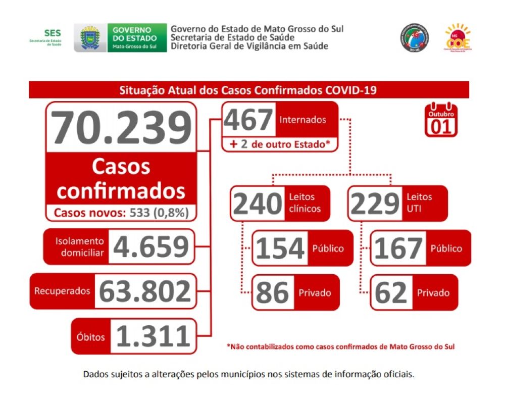 As internações permanecem na média. Com a atualização dos dados, Mato Grosso do Sul possui 469 casos de internação, sendo 240 em leitos clínicos e 229 em leitos de UTI.