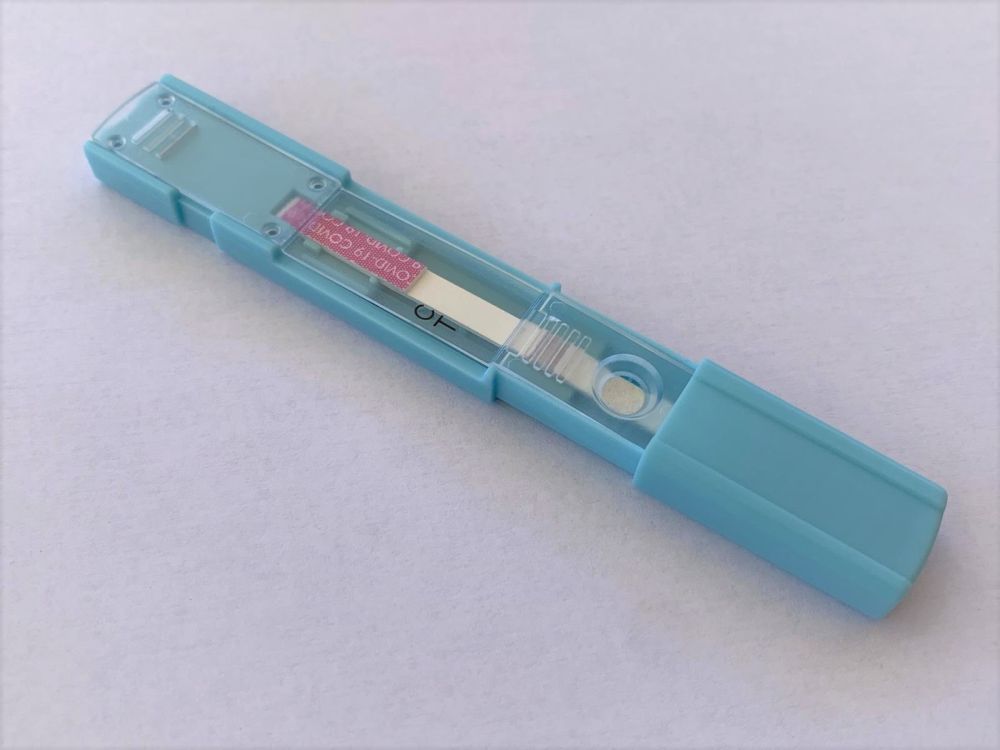 “O instrumento de análise é semelhante ao de um teste de gravidez, se o paciente está infectado ou não pelo coronavírus é indicado por meio de linhas que aparecem no visor”, explica Rodrigo.