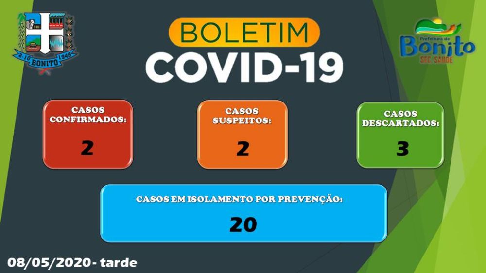 Até a última sexta-feira (08), a Secretaria de Saúde de Bonito registrou dois casos positivos de Covid-19 no município. Como já foi informado, o primeiro paciente trata-se de um idoso que esteve em São Paulo, regressando no sábado (02), ele foi testado e o resultado divulgado nesta quinta-feira (07).