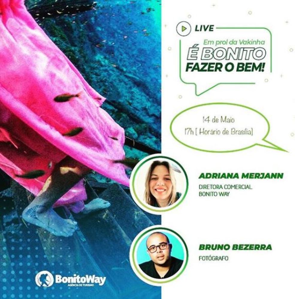 A agência de turismo Bonito Way, em Bonito (MS), realiza nesta quinta-feira (14), a partir das 17 horas (horário de Brasília), a live em prol da vakinha online "É Bonito Fazer o bem", com o objetivo de auxiliar os guias de turismo e motoristas que atuam no destino de ecoturismo.