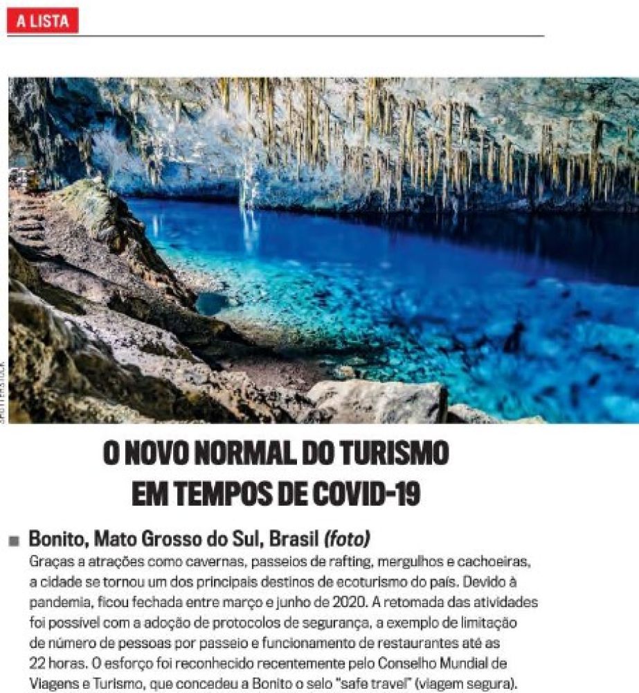 "Graças a atrações como cavernas, passeios de rafting, mergulhos e cachoeiras, a cidade se tornou um dos principais destinos de ecoturismo do país. Devido à pandemia, ficou fechada entre março e junho de 2020. A retomada das atividades foi possível com a adoção de protocolos de segurança, a exemplo de limitação de número de pessoas por passeio e funcionamento de restaurantes até as 22 horas. O esforço foi reconhecido recentemente pelo Conselho Mundial de Viagens e Turismo, que concedeu a Bonito o selo “Safe Travel” (viagem segura)", diz a publicação.