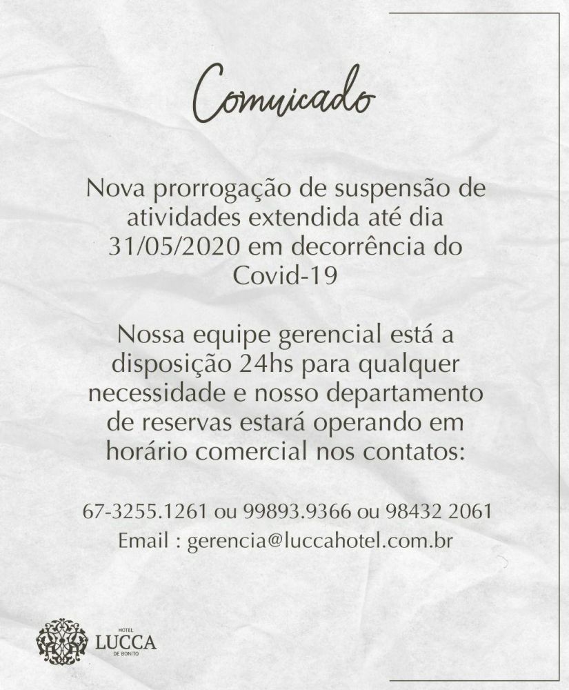 O Lucca Hotel , localizado no destino de ecoturismo brasileiro, Bonito (MS), anunciou que irá estender a suspensão das atividades até o dia 31 de maio.