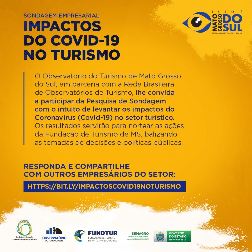 O Observatório do Turismo de Mato Grosso do Sul, em parceria com a Rede Brasileira de Observatórios de Turismo, desenvolveu a Pesquisa de Sondagem Empresarial, com o objetivo de levantar os impactos da pandemia de coronavírus, causador da doença Covid-19, no setor de Turismo. Os resultados servirão para nortear ações e políticas da Fundação de Turismo de MS (Fundtur-MS), balizando as tomadas de decisão e políticas públicas.