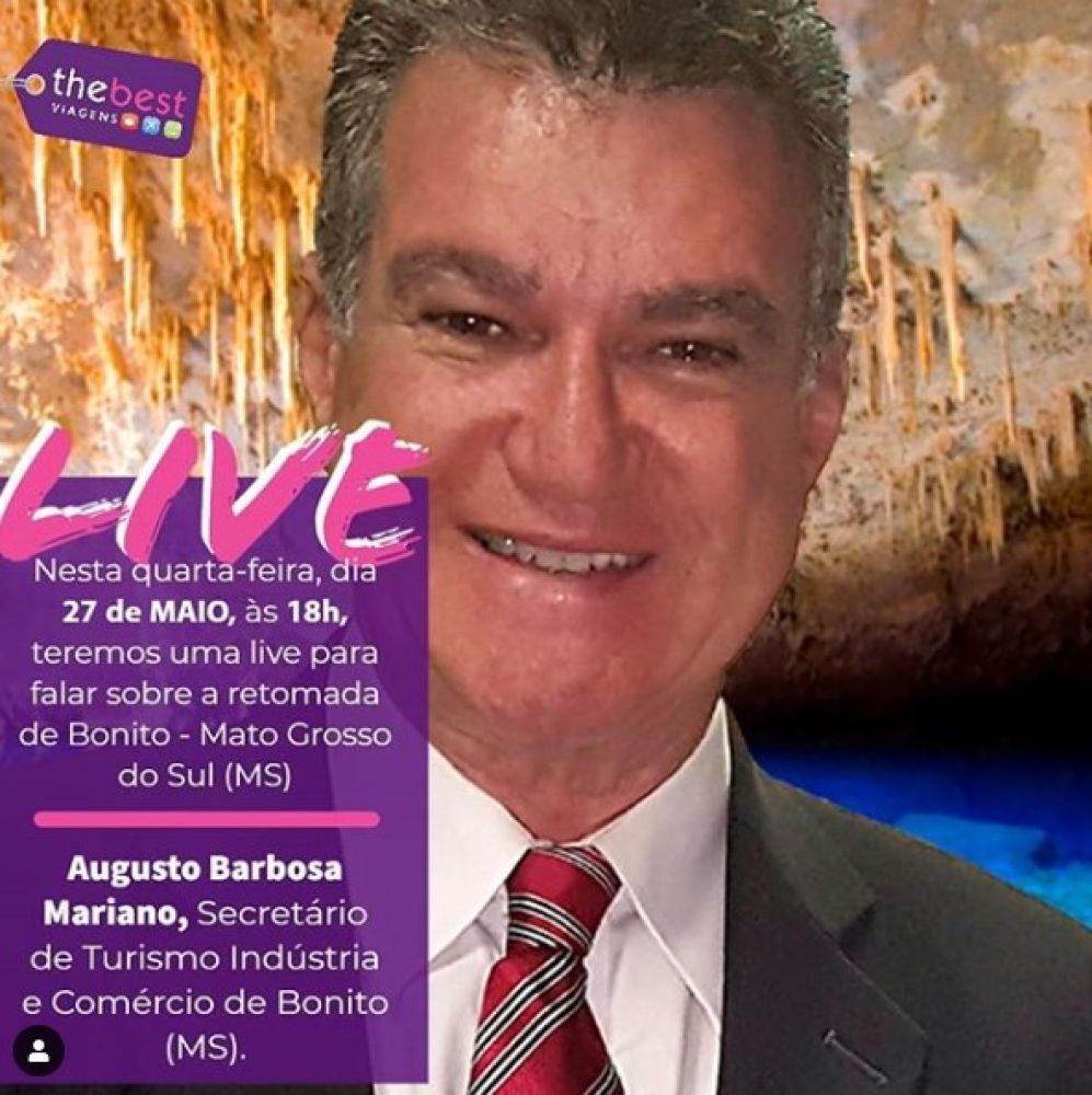 Nesta quarta-feira (27), às 17h, o secretário de Turismo de Bonito, Augusto Barbosa Marinho, participa de Live no Instagram para falar sobre o processo de retomada do turismo no município.