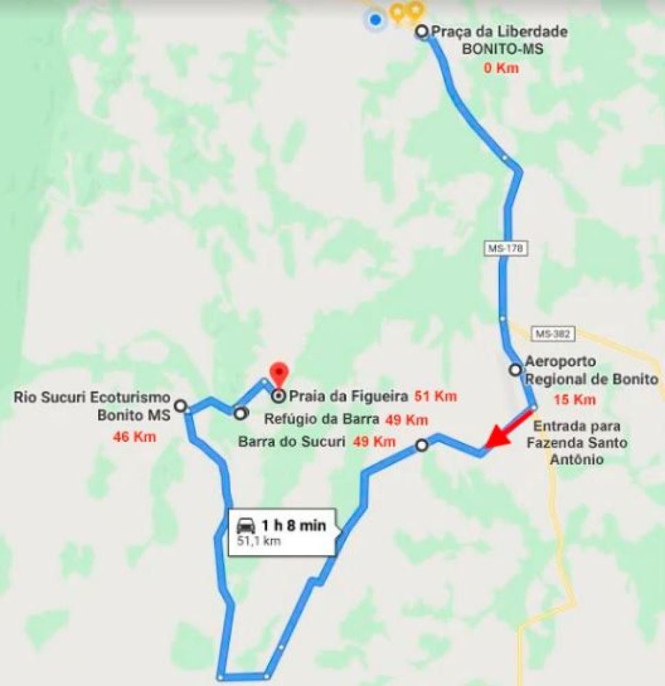 O acesso aos atrativos Barra do Sucuri, Praia da Figueira, Refúgio da Barra e Rio Sucuri deve ser feito por um caminho alternativo que está mostrado na imagem ao lado.